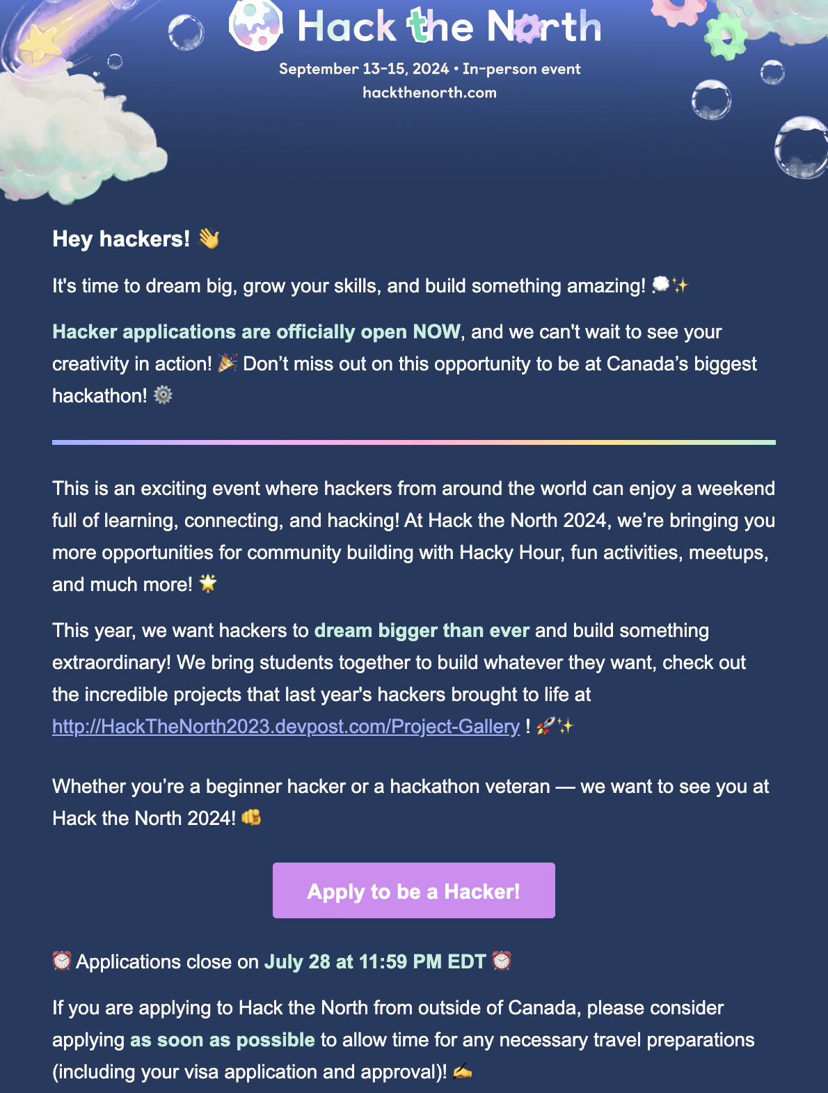 Check out a sample of some of the copywriting I’ve done during my time as a Marketing Organizer for Hack the North 2024!